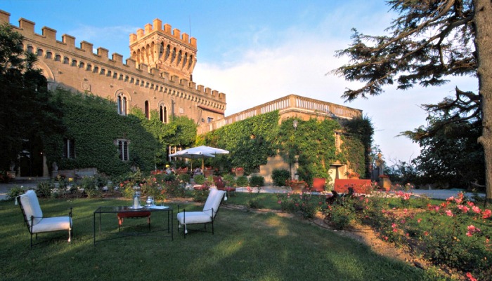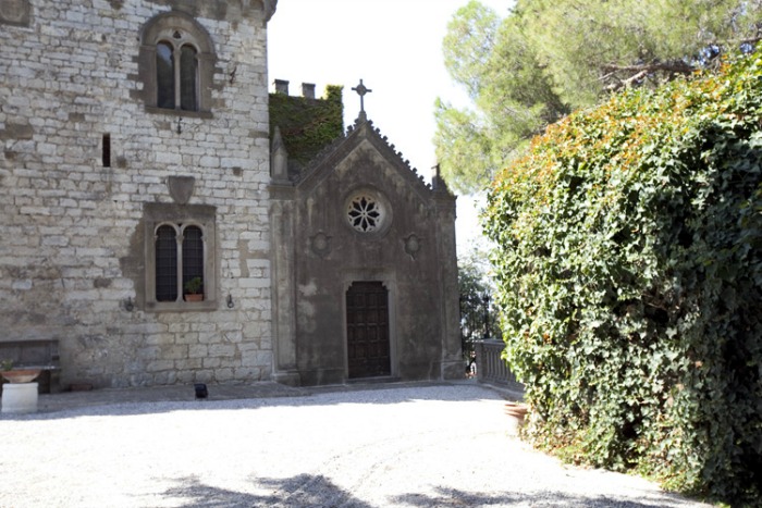 Garden of roses, shaded pool area overlooking a terraced olive grove and the courtyard of the castle.