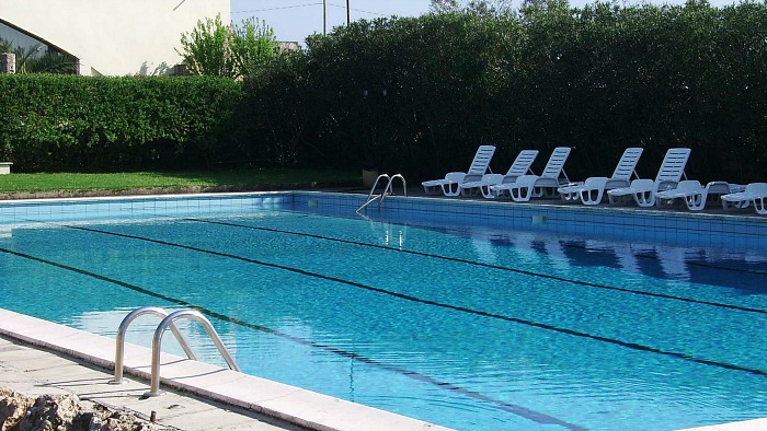 A huge garden with pool and gazebo.