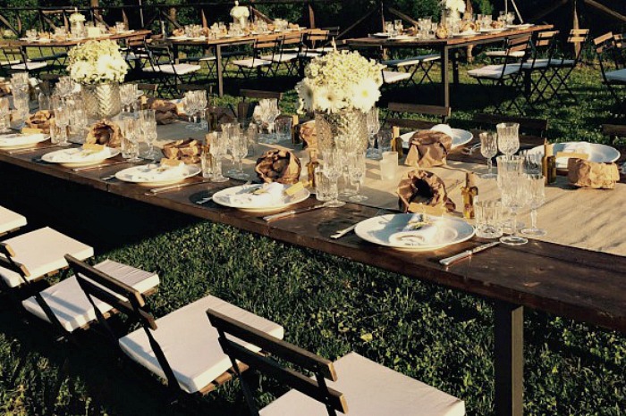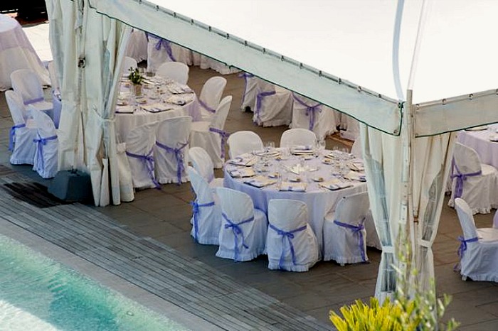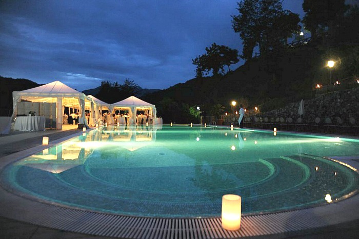 Terrace, marquee, gardens and pool.