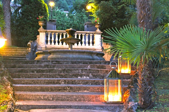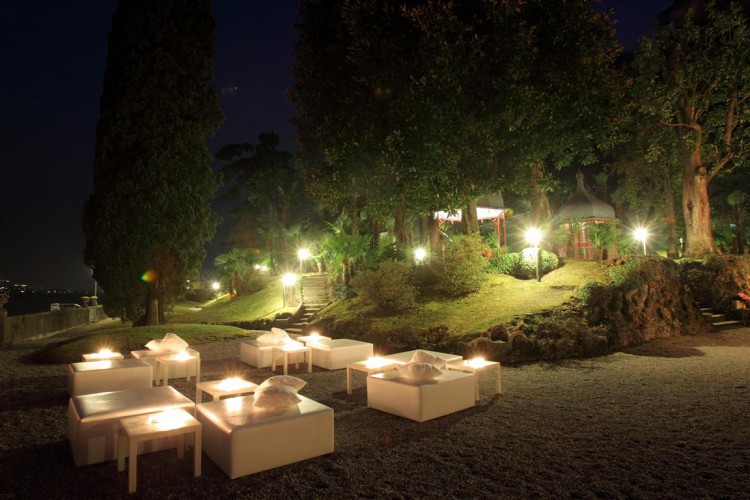 The hotel has a beautiful park with very old trees and swimming pool, where its possible to set up marquees. Especially charming is the stone staircase that during the events is illuminated by candlelights.