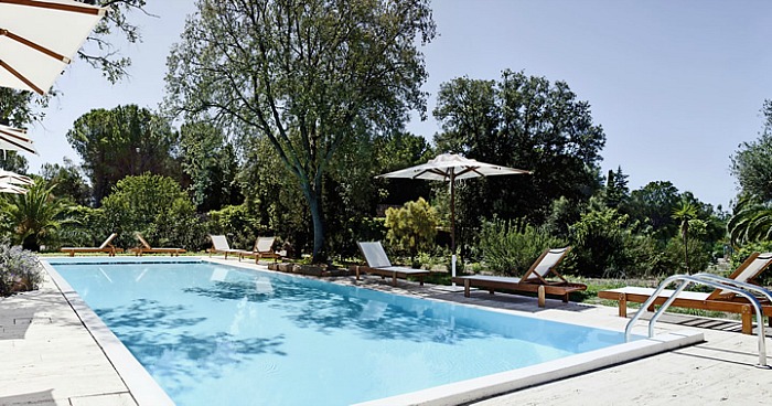 Pool with sunbathing area of Tuscan travertine and green lawn, private beach for cocktails and celebrations.